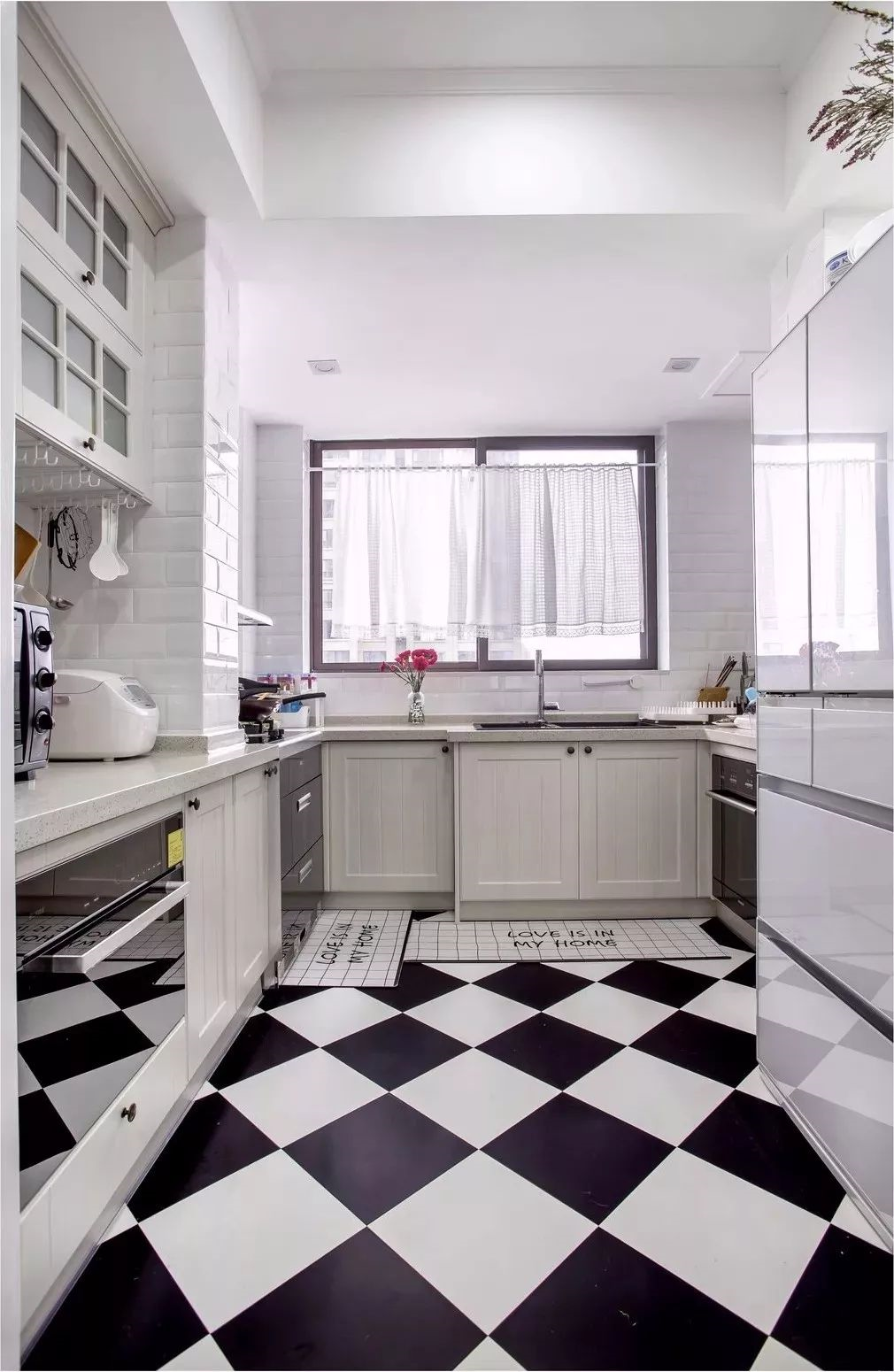 黑白相間的地磚看起來很有格調(diào),整個(gè)廚房干凈整潔,并且由于空間格局原因,看起來寬敞。
