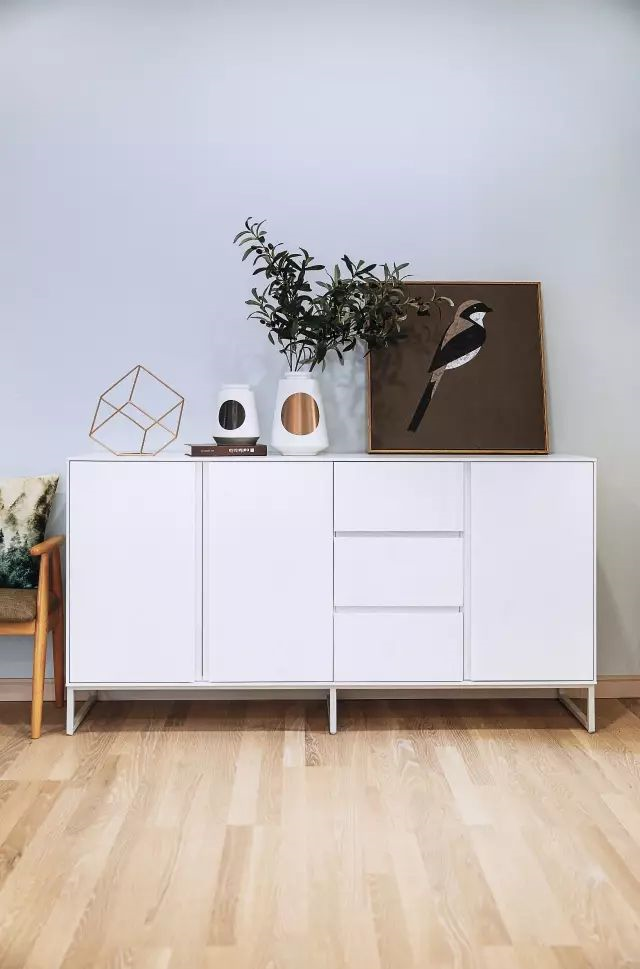 ▲入戶左側(cè)設(shè)置了簡(jiǎn)易的玄關(guān)柜,方便收納常用的鞋子。白色玄關(guān)柜線條簡(jiǎn)潔,搭配帶著黃銅元素的擺設(shè),讓人一眼看去就能體會(huì)到這個(gè)家的品質(zhì)。