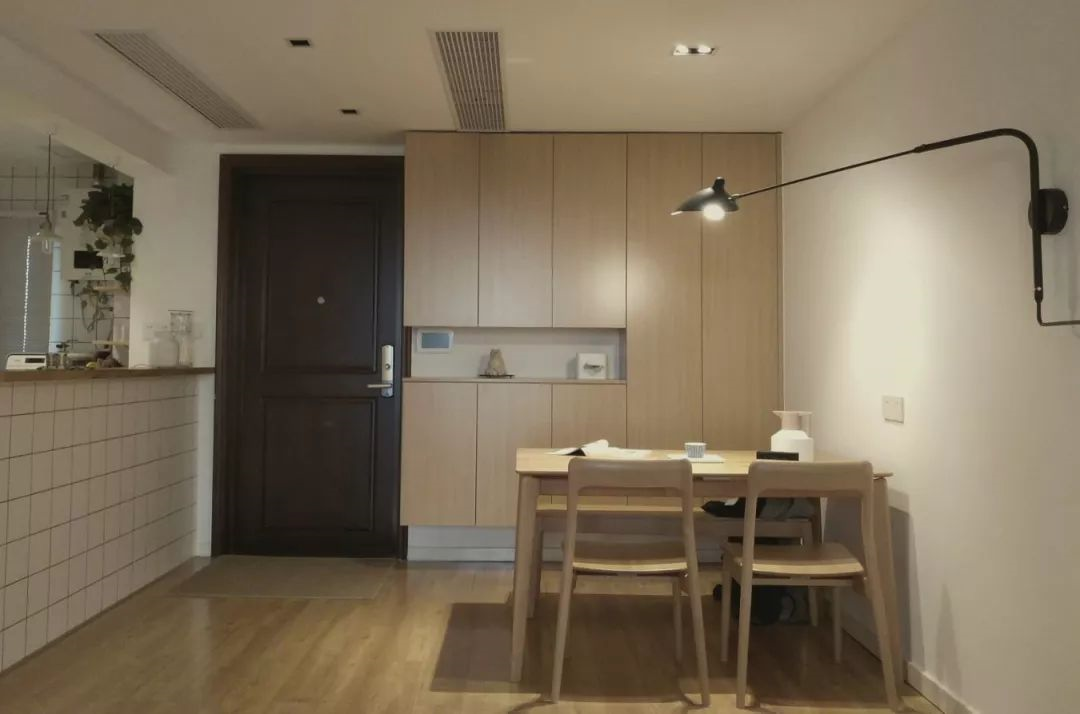 入戶沒(méi)有玄關(guān)的戶型,靠著餐廳的墻面做了到頂?shù)男?,中間和底部的留空區(qū)域方便屋主的日常使用。