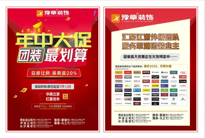 豫章裝飾“年中大促,團(tuán)裝最劃算” 最高返現(xiàn)金20%! 團(tuán)裝3戶(hù)以上,即送6999元品牌煙灶,豫章攜手近百品牌承諾:2020年最低,保價(jià)兩年,買(mǎi)貴補(bǔ)差...更多優(yōu)惠活動(dòng)請(qǐng)聯(lián)系我們!